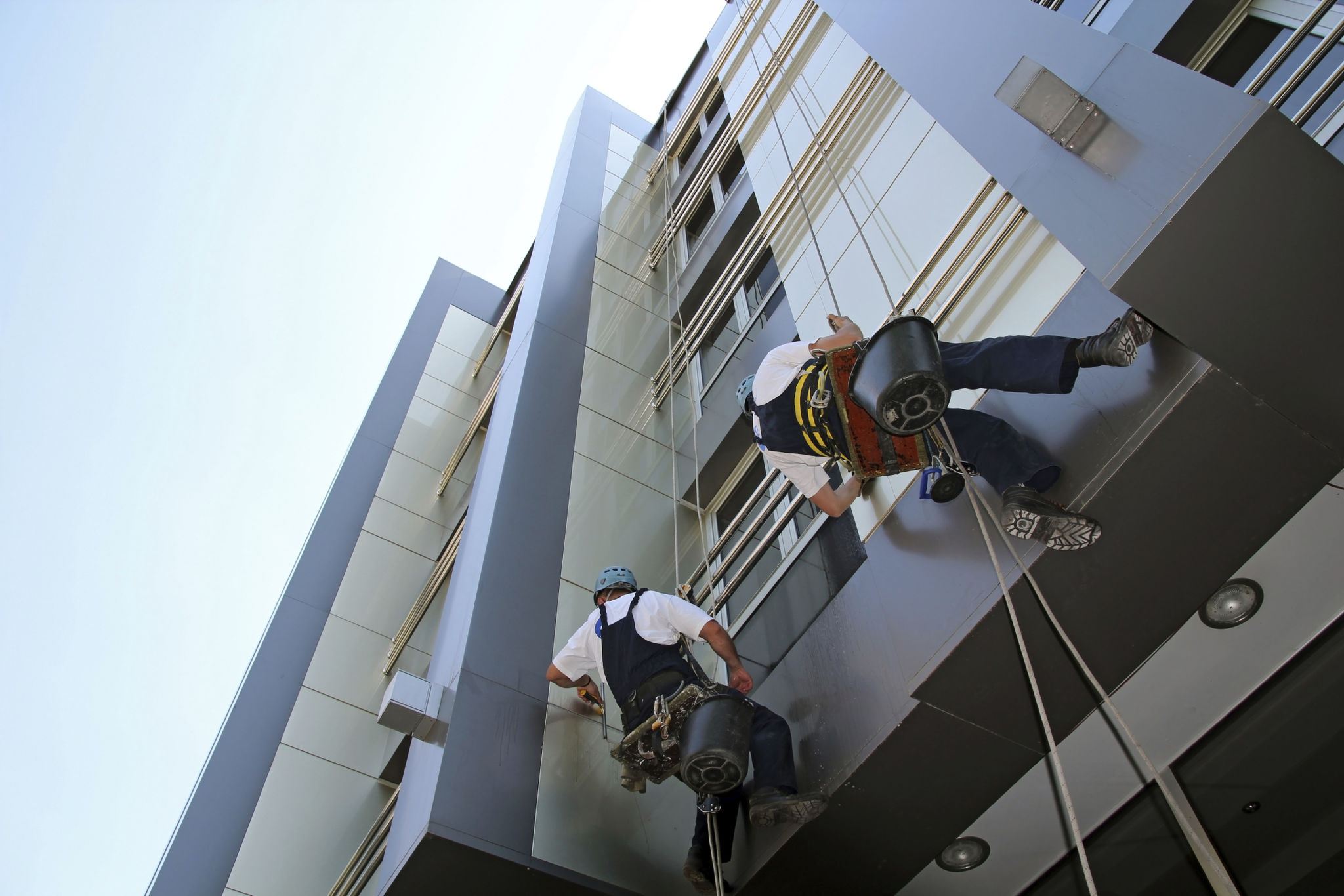 Utilização de técnicas de escalada e cordas para limpeza de paredes externas, janelas de edifícios altos ou de difícil acesso